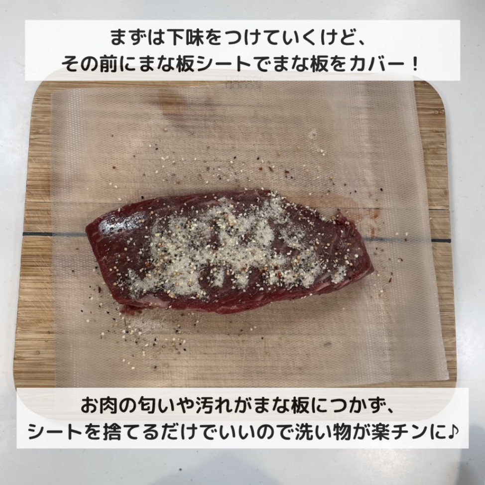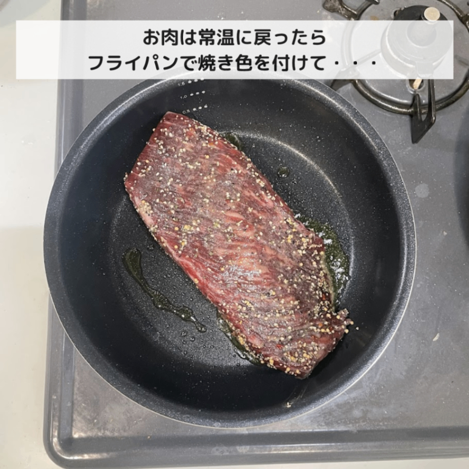 ①牛肉に小さじ0.5の塩、小さじ0.5のブラックペッパーをすりこむ。 ②そのまま牛肉は常温に戻しておく。(時期により異なりますが、一時間程度) ③ソースの材料を玉ねぎのすりおろし以外全部シリコンバックに入れておく。 ④フライパンにオリーブオイルを入れて、熱されたら牛肉を入れ、全面に焼き色をつける。同時に鍋にお湯を沸かす。 ⑤焼き色がついたら、お肉をアルミホイルで包み、シリコンバックに入れる。蓋を開けたまま、③と一緒に鍋に入れる。 ⑥5分程茹でたら火をとめ、たれは取り出し、ローストビーフのシリコンバックは鍋に入れたまま蓋をして15分おく。(お肉の大きさによって時間を調整してください) ⑦その後、お肉を取り出し、カットする。(この時、あまり置き過ぎると赤みが薄れます) ⑧ソースにすりおろし玉ねぎを混ぜて、かければ完成です。