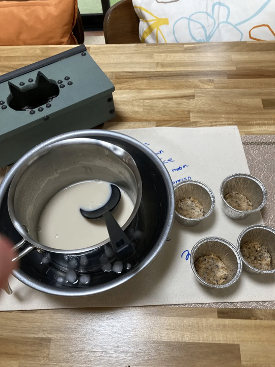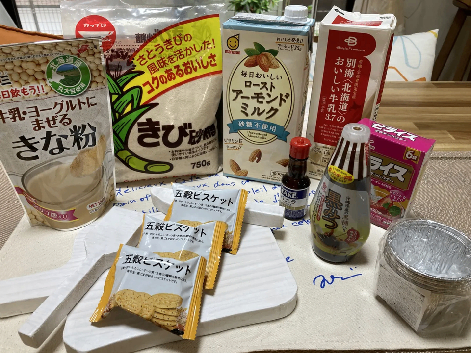 ・五穀ビスケット 40g 2袋6枚 ・豆乳 300ml ・牛乳 大さじ 1 ・きび砂糖 30g ・バニラエッセンス 少々 あれば ・お好みで 黒蜜 きな粉 ・容器 プリンカップ DAISO5枚入を利用しました カップが小さめなのでお好みでカップを大きくして材料2倍で作ってください。