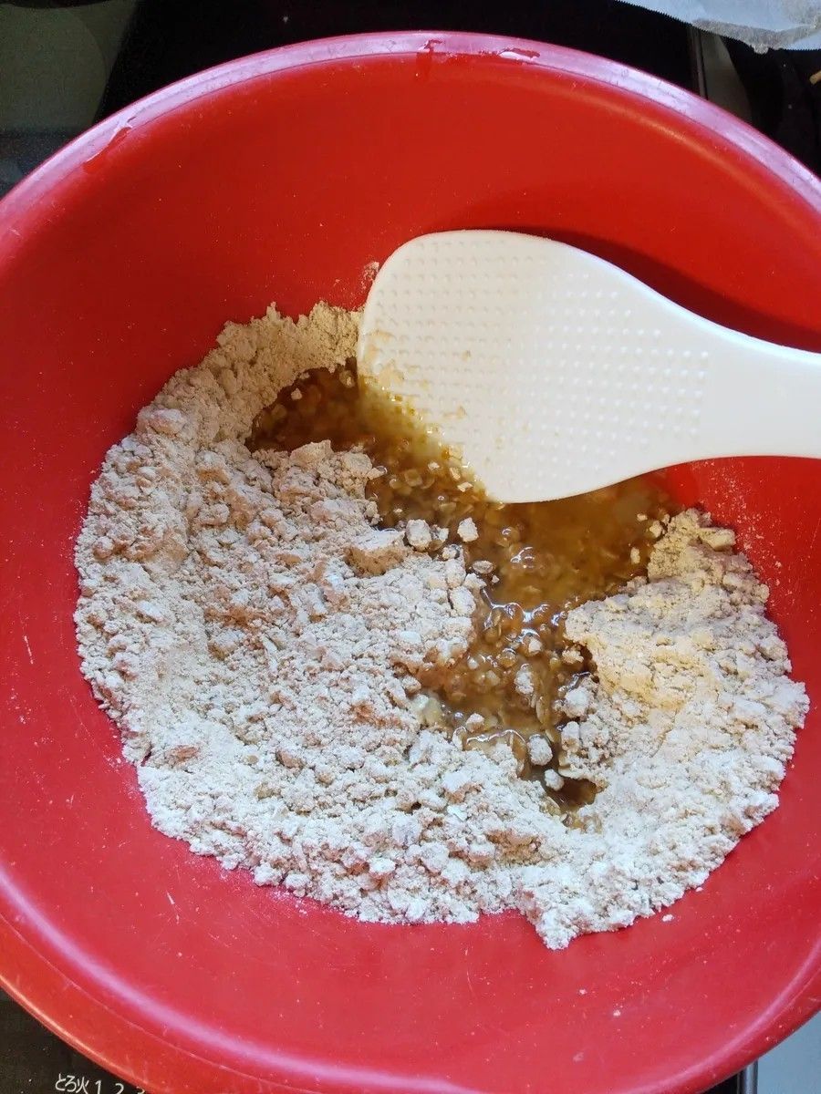 ①粉類(・印)を混ぜ合わせてから液体(▲)を入れ混ぜる ②粗みじんにした栗を入れ混ぜる ③適当な大きさに手で丸めてたいらにする ④余熱ありの160度10分150度15分で焼く
