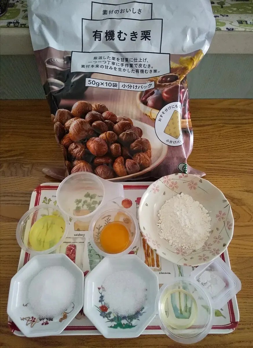 卵黄生地用 ・有機むき栗…23g(3粒) 1.シフォンケーキ ・卵黄…卵1個分(22g) ・グラニュー糖…5g ・サラダ油…10g ・お湯(40℃)…15cc ・薄力粉…25g ・ベーキングパウダー…1.5g メレンゲ用卵白…卵1個分(34g) ・グラニュー糖…20g 2.アイスクリーム ・有機むき栗…1.5粒 ・バニラアイス…12g ・マロンペースト ・有機むき栗…1.5粒 ・牛乳…10ml ・砂糖…3.5g ・塩…少々