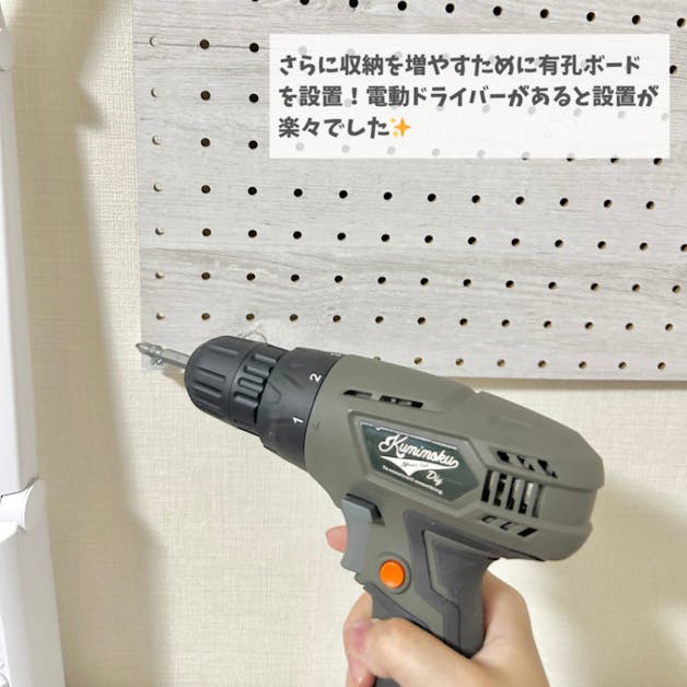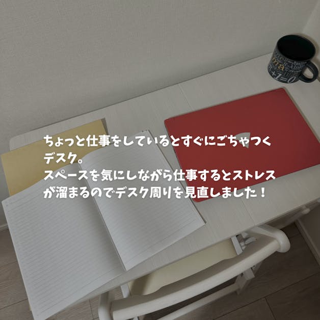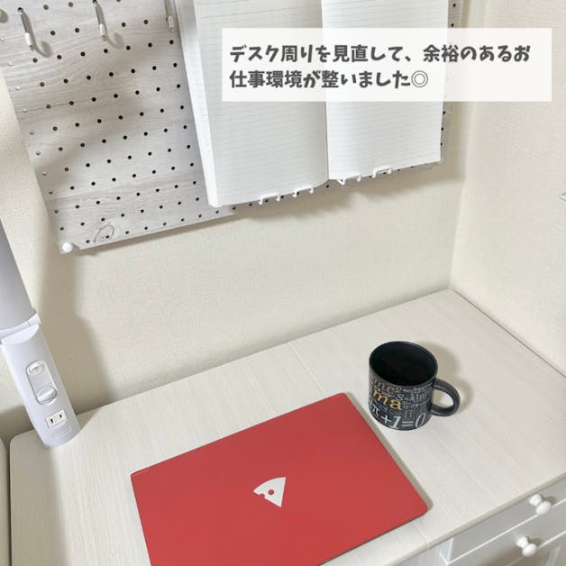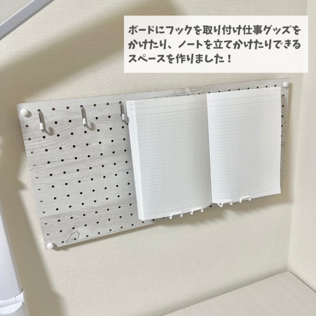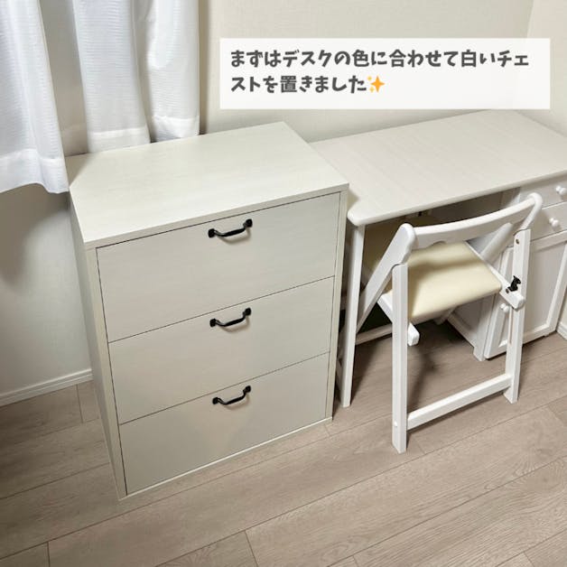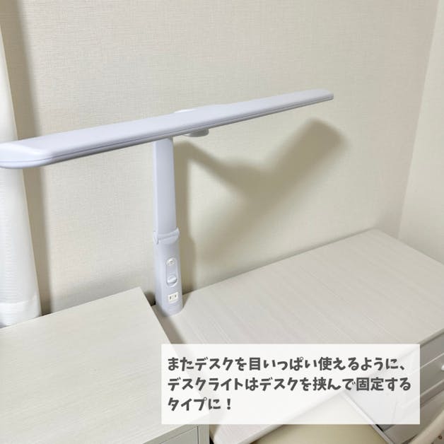 ごちゃつきがちなデスク周りを快適に整えるため、まずは白のチェストを導入! 収納力抜群で文具や書類の一時置きにも◎ デスクライトはクランプ式にして作業スペースを広々確保✨ さらに有孔ボードを設置して、フックで小物を吊るしたりノートを立てかけたりと収納力をアップ! 見た目もスッキリ、作業効率もアップして、ストレスフリーなデスク環境になりました☺️