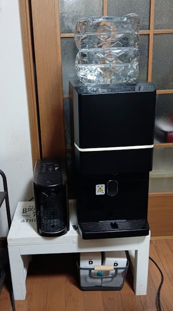 ウォーターサーバーの台をカインズさんのワークショップで作った椅子や台の作品を並べて一番安定して丈夫な「ミニベンチロング」に決まりました。 コーヒーポッドも並べました。DRIP PODも下に置けて便利になりました。
