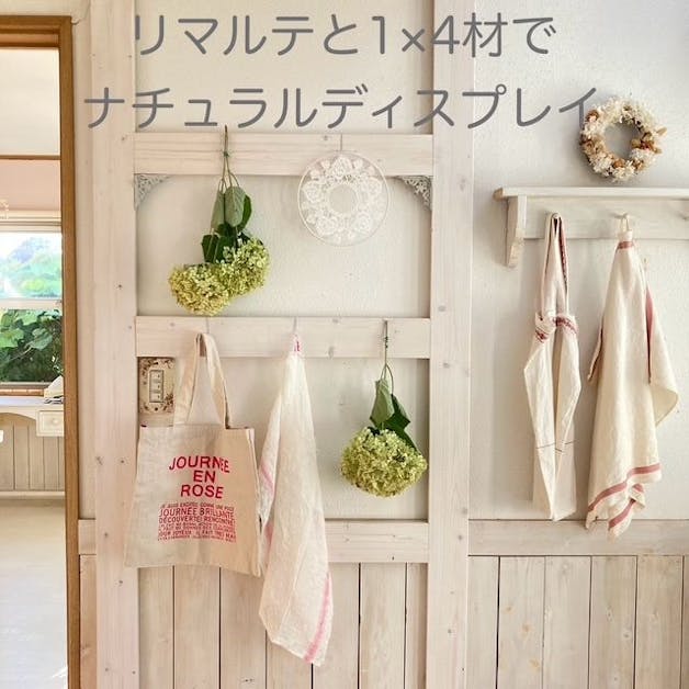 1×4材とカインズオリジナルのリマルテを使って、ナチュラルなディスプレイコーナーをつくりました🌸 リマルテをビスでとめて、突っ張るだけの簡単D I Yです🌼フックは針金を折り曲げるだけ☺️ DIY初心者にもおすすめのナチュラルインテリアです🌷
