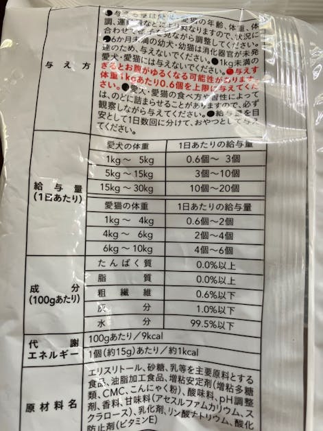 そのままでもうちの子は凍らせても喜んで食べてくれます エリスリトール配合で健康サポートしてくれてカロリーは一個が約1カロリーで脂肪ゼロなので、ダイエット中のワンちゃんにも気にせずあげられます 国産なのも安心でポーションタイプなので冷やしてお散歩にも持って行きます