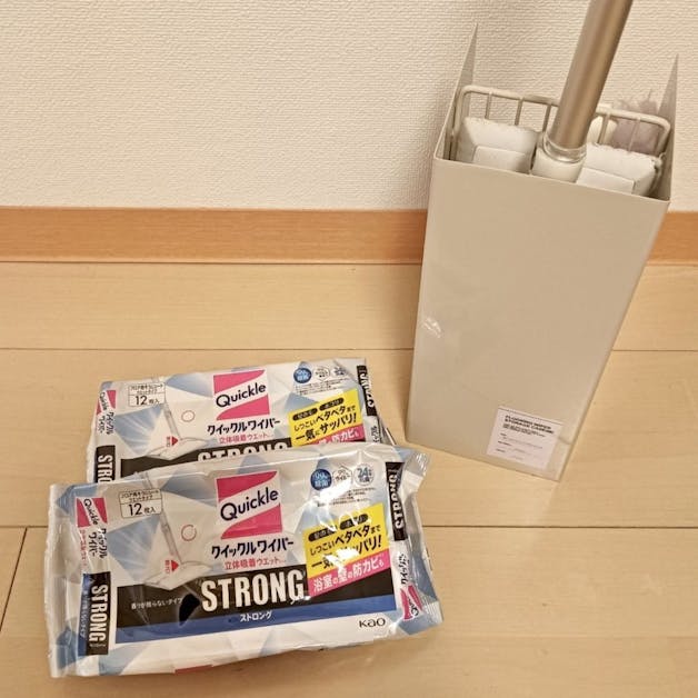 我が家の床掃除担当・綺麗好き夫のお気に入り \\\クイックルワイパーストロング/// ヘタれず、乾かず、ワンフロアしっかり拭き取りできる。ストロングの名は伊達じゃないと絶賛しています。 花王さんの公式サイトにて、使った後は消臭剤として再利用できると発信されていました。普段通りに捨てるだけで、お部屋だけでなくゴミ箱の中までいい香り…✧ 好みもありますが我が家のおすすめはブルーとグリーンです。