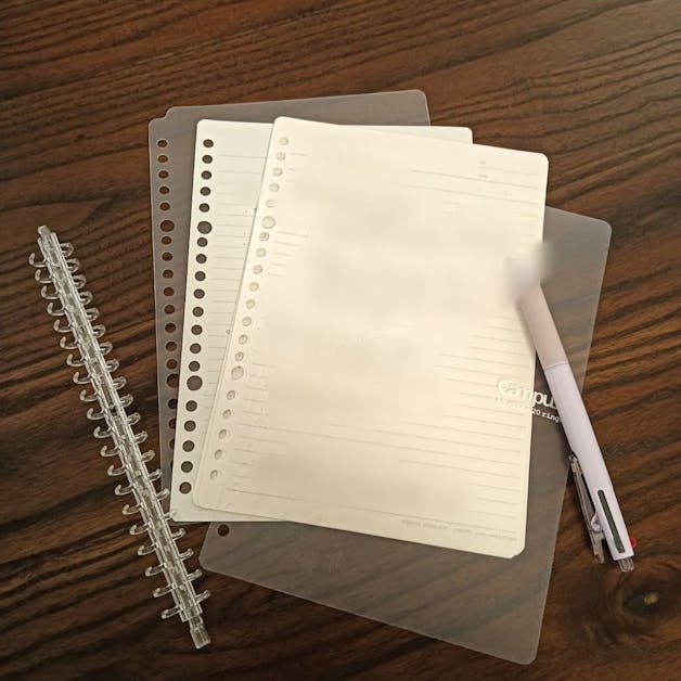 ノートに並ぶくらい定番になったルーズリーフバインダー。こちらは表紙、リング、裏表紙がそれぞれ独立していて背表紙がありません。バックに入れてもかさばらない! おうちで使って頂いてもいいですが、持ち運ぶ必要がある学校用、職場用にオススメです。 表紙を開ききって下敷きにすると、机等がない所でも記入できます。
