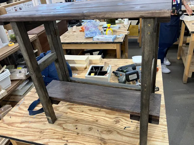 蝶番六個つけて、折りたたみ式になってますが、折りたたむ事はないかと。色は焦茶と黒で古っぽい雰囲気にしました。鮮やかな花が映える色。薔薇が咲いたら薔薇を載せたい。季節に合わせて色々な花や小物を載せたい。
