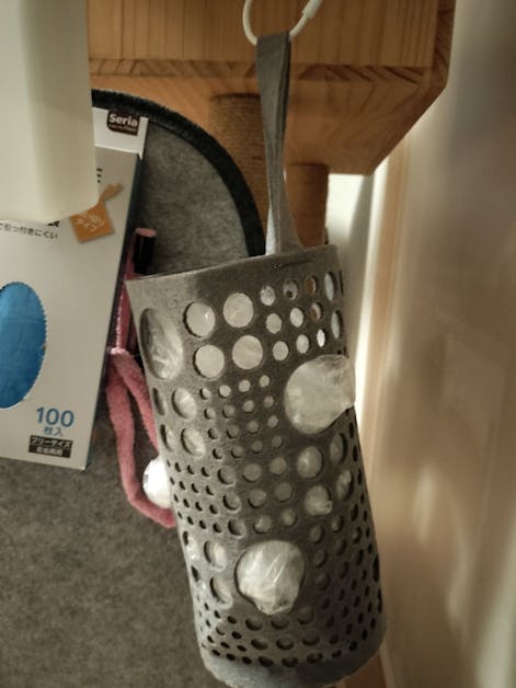 キャットタワーの近くにトイレを設置しています。直ぐにトイレの処理ができるようにポリ袋ストッカーにナイロン袋を入れています。お洒落で、ポリ袋が取り出しやすく便利です。
