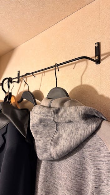 壁の空いているスペースにハンガー掛けとしてこのマルチバーを取り付けました。耐荷重も5kgあるので、結構洋服や上着をかけておくことができます。付属のネジだと壁に穴が残ってしまうので、自宅にあったピンで固定しました。