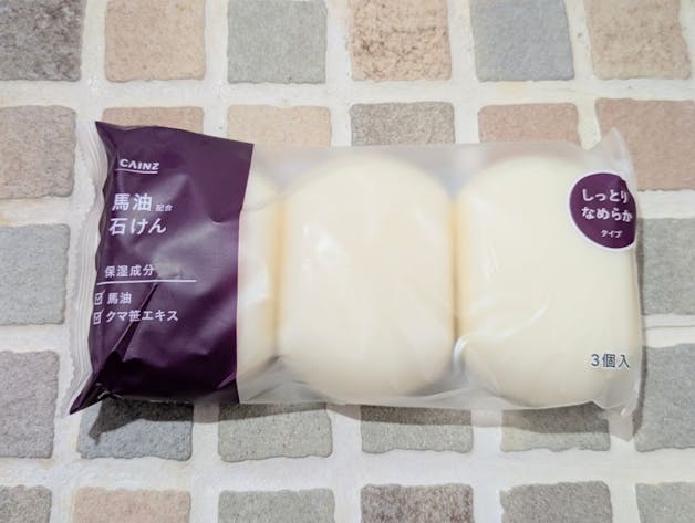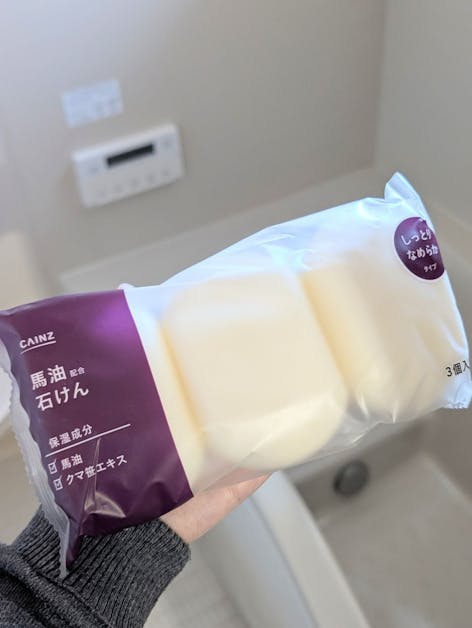 液体ボディソープってすぐなくなりませんか? 固形石鹸なら長持ちし、しかも3つ入りで298円! 1つ約100円なのでコスパ最強です! ボディソープと比べ ボディ石鹸の購入する頻度は格段に減りました。 きもち大きめサイズ。 ほんのり優しい香りで石鹸用のネットに入れ 泡立てて使用しています。 冬場は保湿目的で馬油タイプのこちらを その他の季節は同シリーズのほんのり香るはちみつタイプを使用しています