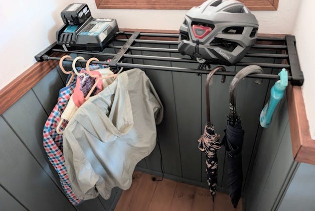 我が家の玄関収納は小さいシューズクローゼットのみ。 隣の空いたスペースに ワイドタイプの突っ張り棒を置いて 傘・アウター・ヘルメットを置く事に! 浮いてるから埃もたまらず掃除しやすい! 扉を開けるひと手間がなしで気軽に使える! 付けるのを忘れがちな液体虫除けを 見える所に置けました★ 突っ張り棒にして大正解◎ 黒がまたオシャレで大満足です★ 実際はもっと傘が大量な事は内緒です(笑