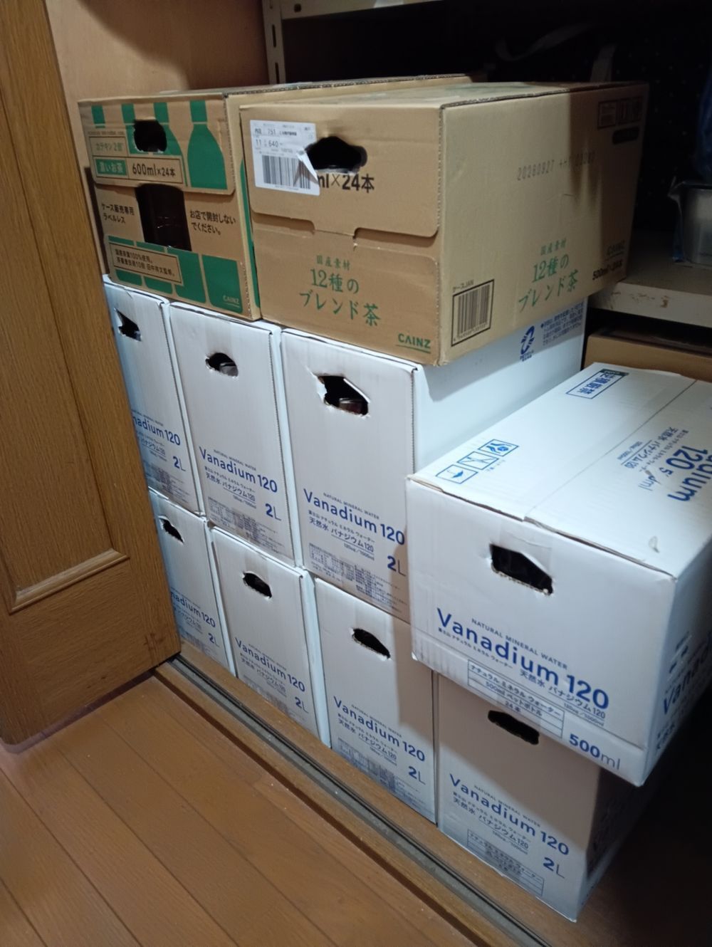 水の備蓄は以前からやってましたがカインズさんでリーズナブルな水やお茶を見つけてからカインズさんに変えました。 C富士山天然水バナジウム、Cお茶ラベルレス、C12種のブレンド茶をストックしてます。買ったら古いのを前に新しいのは後にと入れ替えてます。