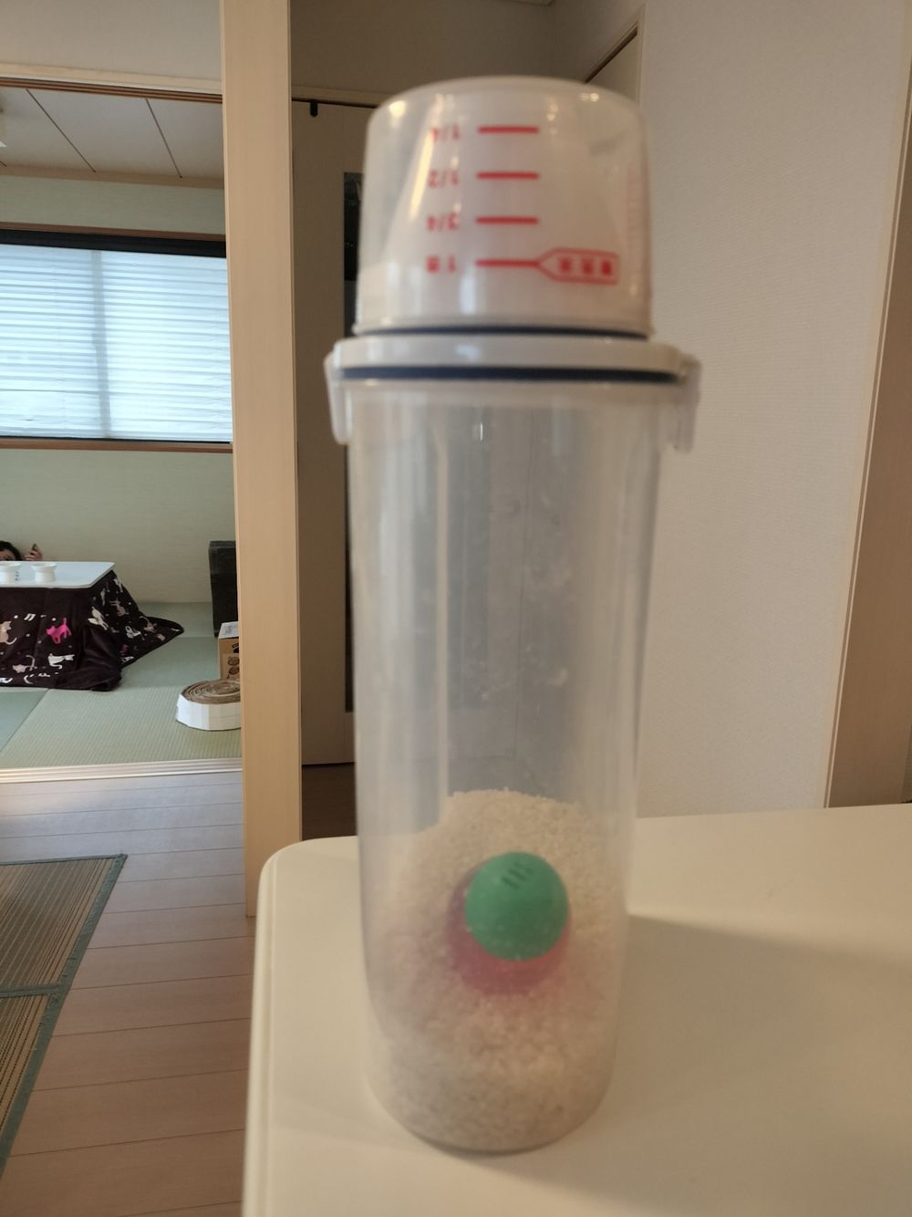 お米の収納に便利なケースです。蓋でお米の量が測れます。お米を美味しく食べるために、カインズの店頭で目立つところに置かれていた米唐辛番も購入しました。米唐番は見た目が可愛いので見るとテンションが上がります。