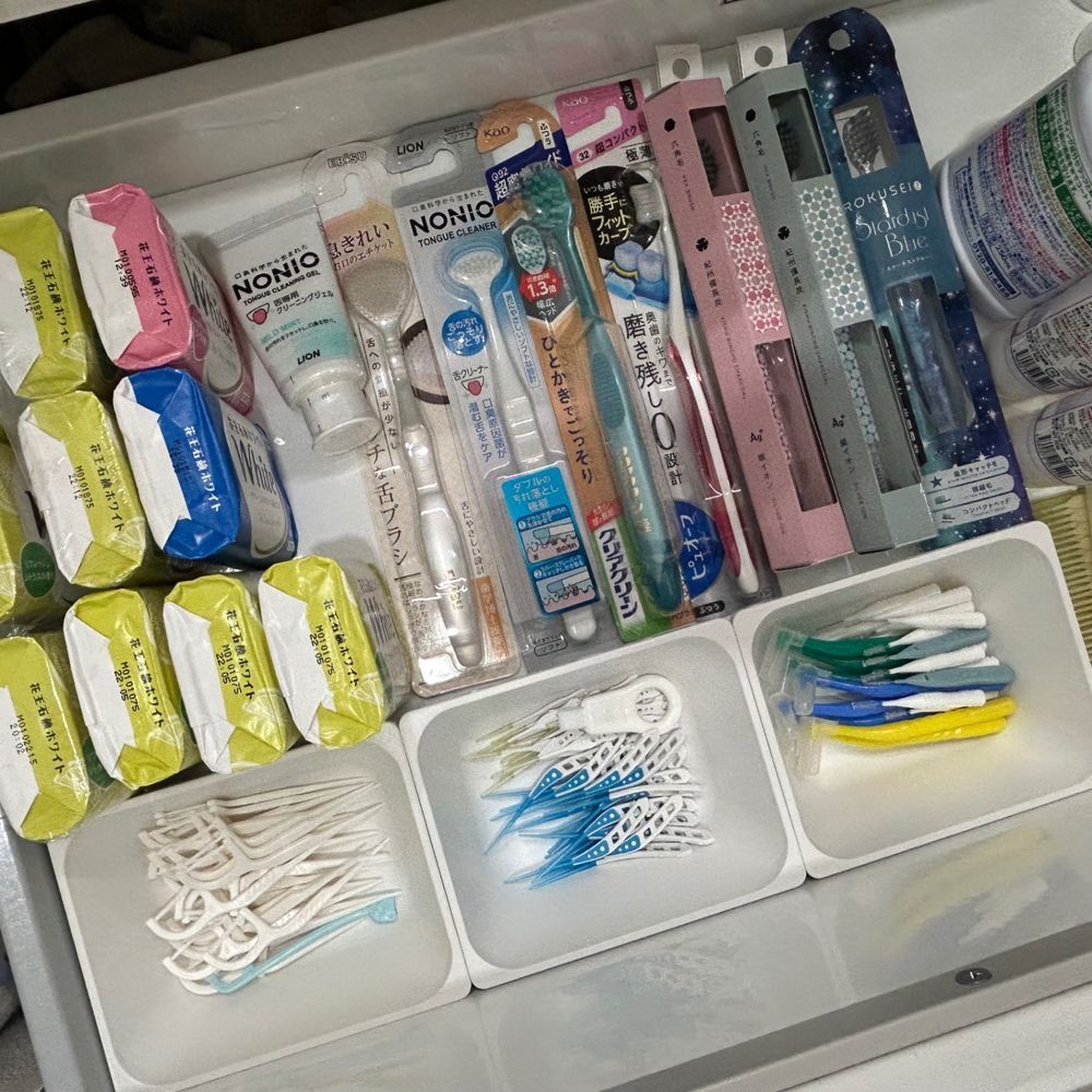 こちらは洗面台の引き出し上段です。 歯磨き粉のストックがなくなったので買い出しへ。 出掛ける前に写真を撮っておくとお店で確認しながらお買い物できますね。いつもは記憶に頼っていました。 歯磨き粉の他に歯ブラシ、糸ようじや歯間ブラシなど補充できました。