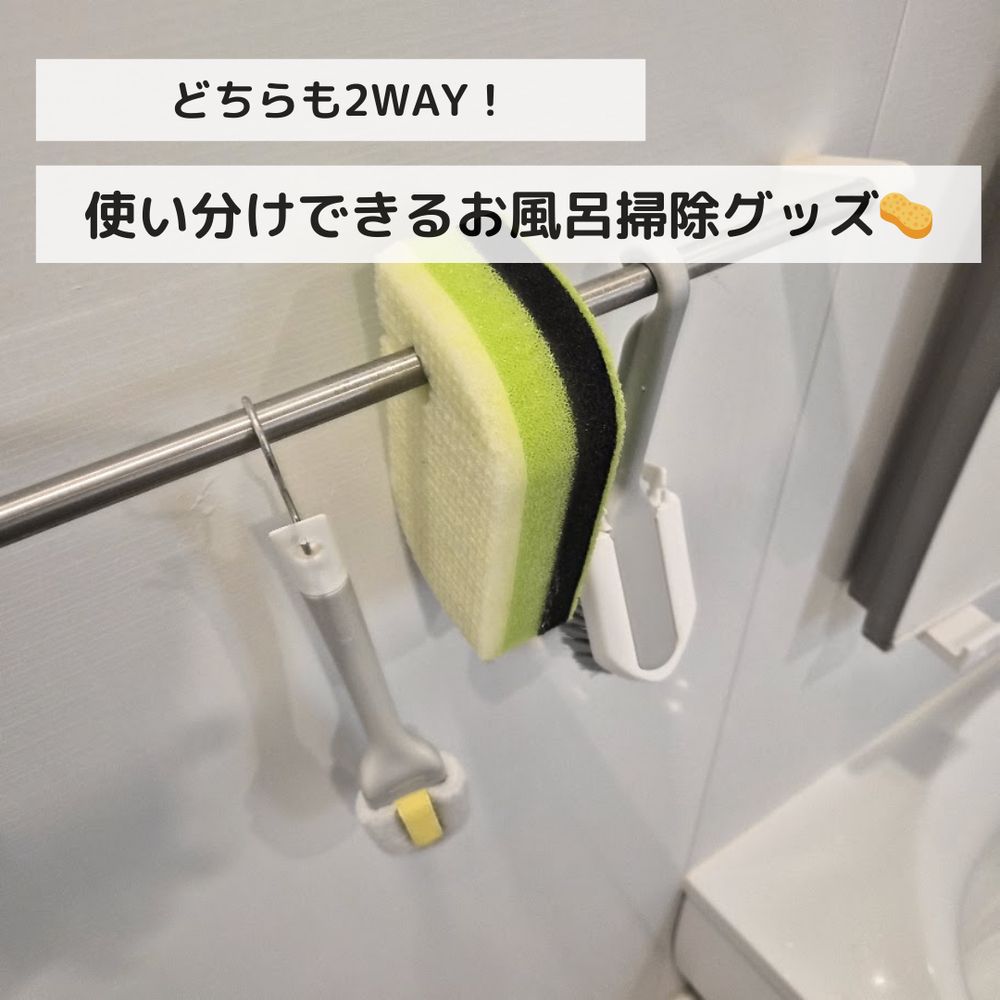 前のブラシが汚くなってきたのでスポンジと一緒に新調! どちらもタオルバーに吊るして収納でき、乾きやすく衛生的。 2WAYバスブラシは広い面と細かい部分を使い分けでき、 床や目地までしっかり掃除できます✨ バススポンジは水だけでも汚れが落ちやすく、 やわらかい面としっかり洗える面を用途に応じて使い分け可能👍 場所や汚れに合わせて使えるので、お風呂掃除がぐっとラクになりました😆
