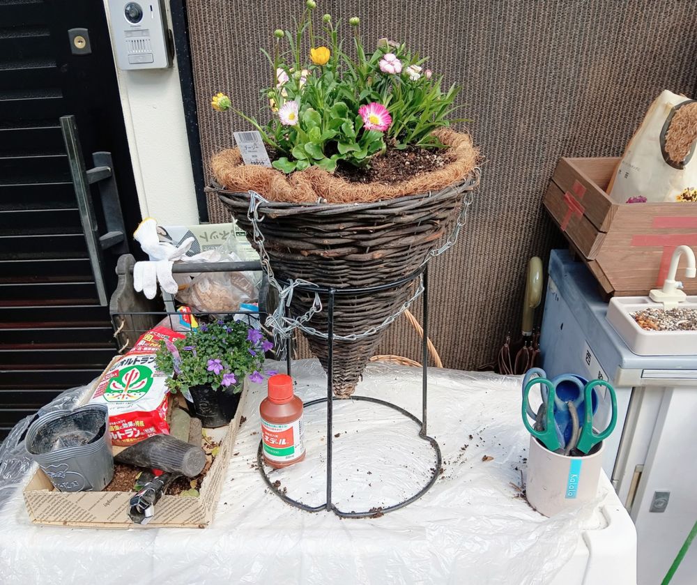 ホームボックスの上にナイロンを広げて机代わりに利用してます。寄せ植え用のスコップや土、手袋など、こまごましたものは右側の収納庫に入っているので手を伸ばせばすべて準備できます。 片付けもささっと収納庫に直せば完了。