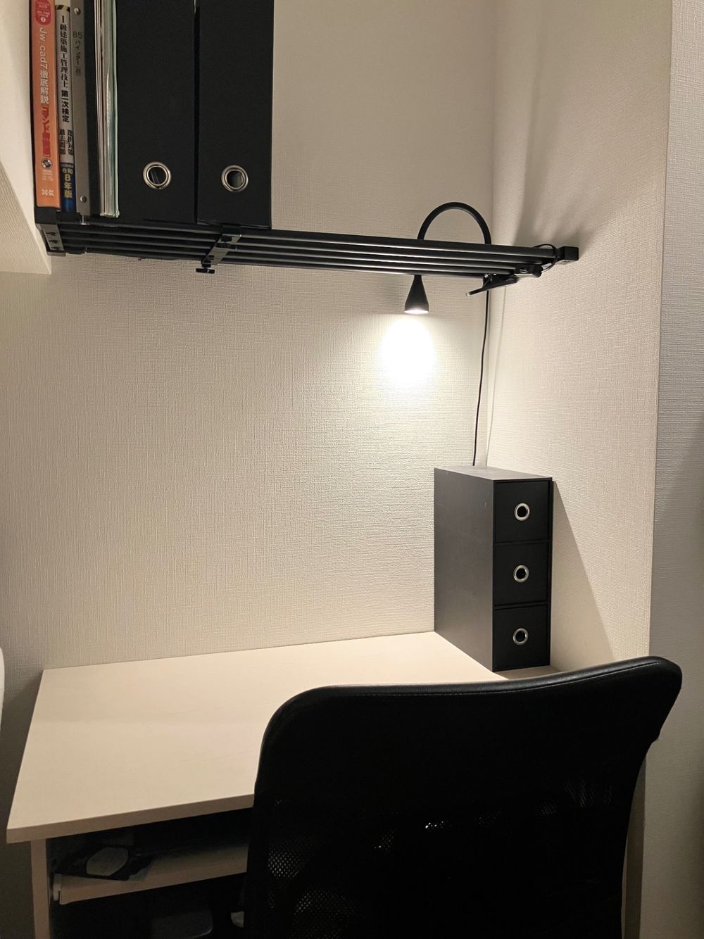 自分の書斎の作業スペースです。パソコンで仕事をするときに、手作りのプリンターラックの下段にカインズで購入したスキットに文具を入れ、脇にはレターラックにコピー用紙を収納しています。この場所で、データ入力、プリントアウトなど一通りの作業が出来るスペースでお気に入りです。