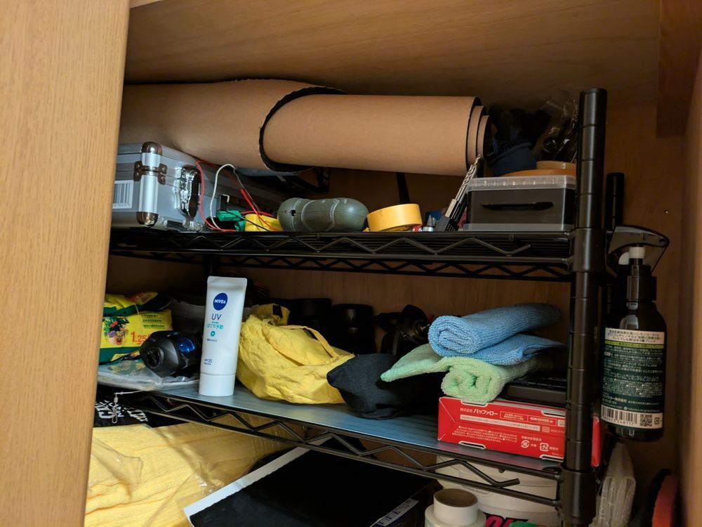 車関係やDIYの材料、観葉植物関係など趣味の道具を取り出しやすいようにラックを使いました。 クローゼットの中にちょうど入り必要な道具が探しやすくなりました 棚は2段使用しています 棚はつけ足し可能で高さ調整も可能です